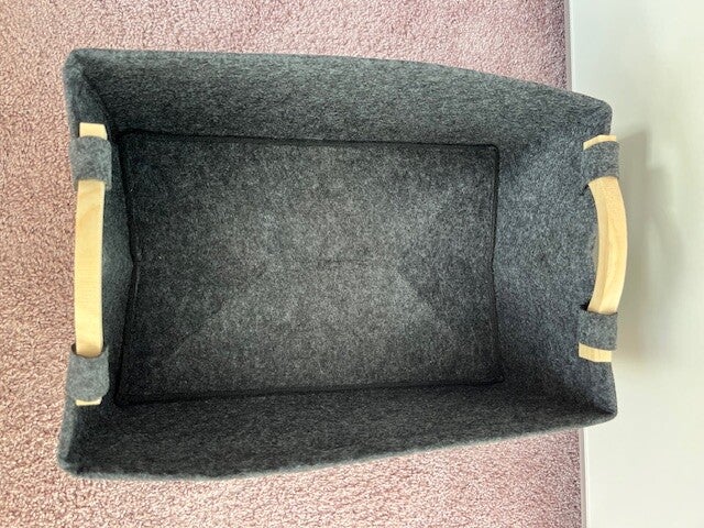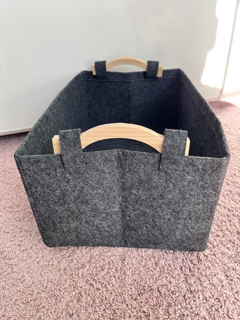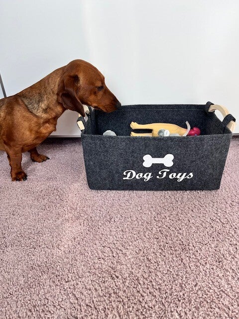 Deze stevige vilten opbergkist in antraciet met witte opdruk "dogs toys" is perfect voor het opbergen van al het speelgoed van je hond. Dankzij de houten handvaten is de kist makkelijk te verplaatsen. Met een afmeting van 37 x 24 cm past hij in elk interieur – stijlvol, praktisch én hondproof!
