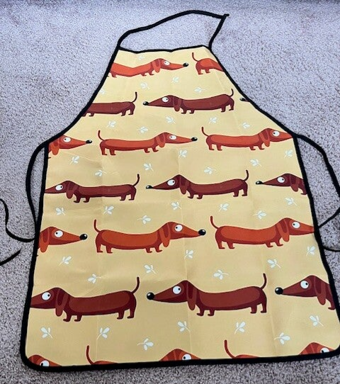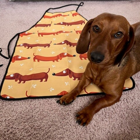 Dit okergele schort met een leger aan bruine teckels is gemaakt voor de echte keukenbaas – of je nou koekjes bakt, planten verpot of gewoon een statement maakt tijdens het BBQ’en. De stevige, stugge stof houdt je outfit schoon én laat zien dat je van honden én handigheid houdt.