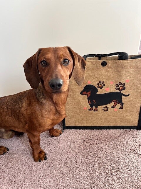 Deze stevige kleine boodschappentas van jute is niet alleen praktisch, maar ook om verliefd op te worden. Aan de voorkant vind je een vrolijke teckelprint met hartjes en hondenpootjes, voor iedereen die trots is op hun viervoeter.